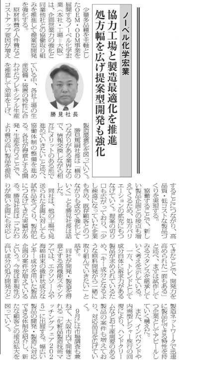 少量多品種を主軸としたOEM・ODM事業を展開するノーベル化学宏業(本社・工場=大阪)は、企画営業力の強化と同業他社との協働取り組みを推進して提案型開発を強化する。